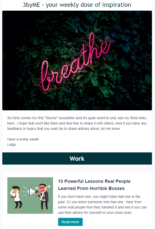 What else is there to say about his era? The subject lines of the 3byMe changed and it changes now every week as I wanted to make it more specific and appealing. This was also the reason why I added a header summarising the topic of the month, this week’s highlight, reading time, next 3byMe (date).